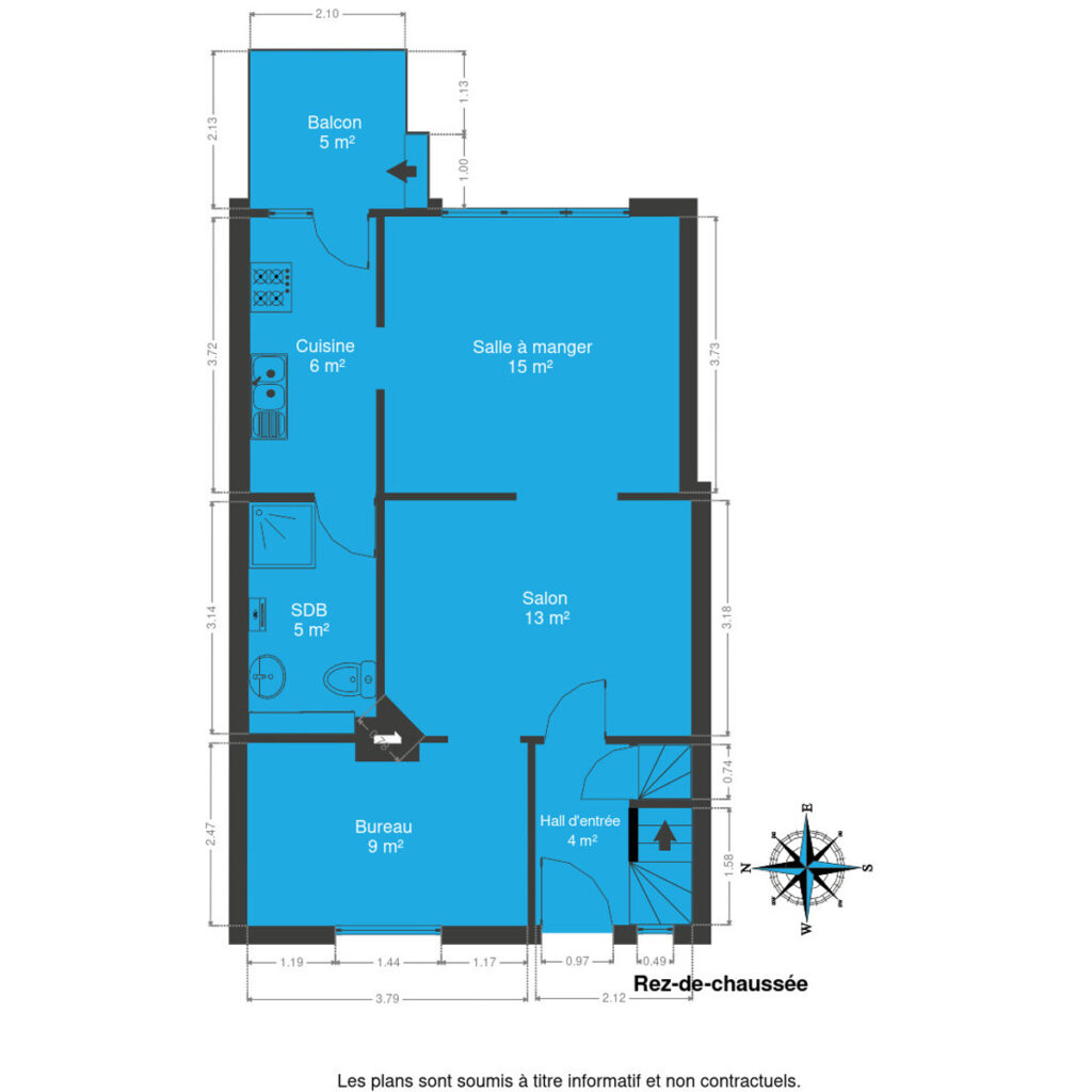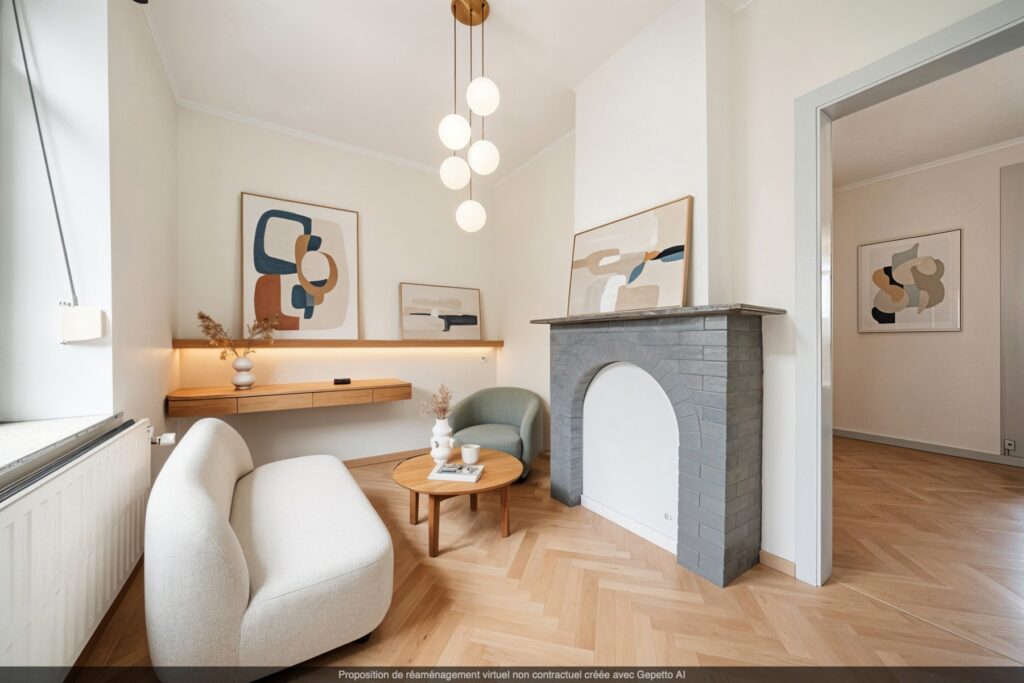 Elle se compose au rez-de-chaussée d’un hall d’entrée, d’un séjour lumineux, d’une cuisine, d’une salle de bains ainsi que d’un bureau pouvant servir d’espace de télétravail ou de petite chambre.