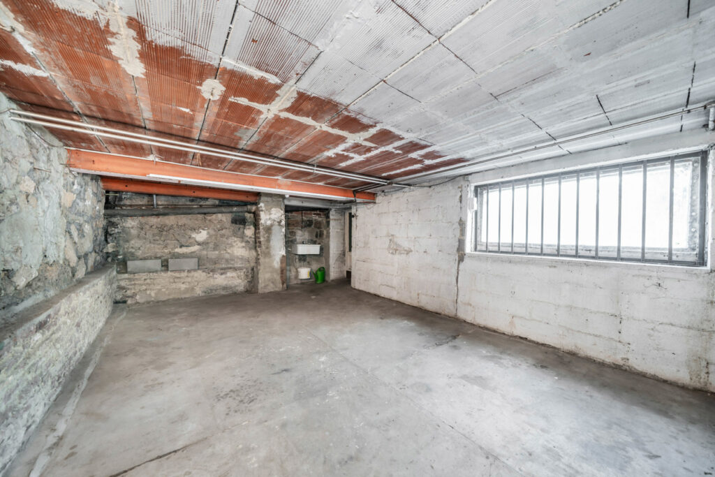 Les caves, présentes sur toute la superficie du bâtiment, offrent un grand espace de stockage. À l’arrière, un jardin agréable complète l’ensemble.